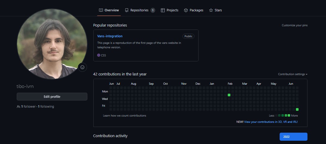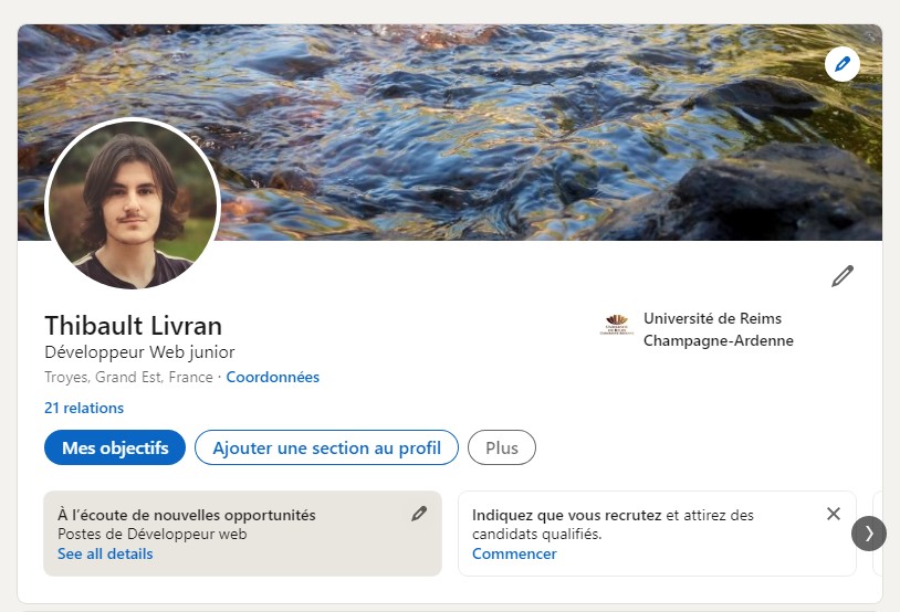 Au long de cette année, j'ai pu me commencer à me construire une présence en ligne. Je me suis inscrit sur LinkedIn afin de commencer à me créer un réseau. Je me suis également inscrit sur Github, car c'est une plateforme quasiment indispensable à tout bon développeur. J'ai également pu me créer un CV que j'ai pu partager sur mes différents réseaux ainsi que sur mon propre site internet.