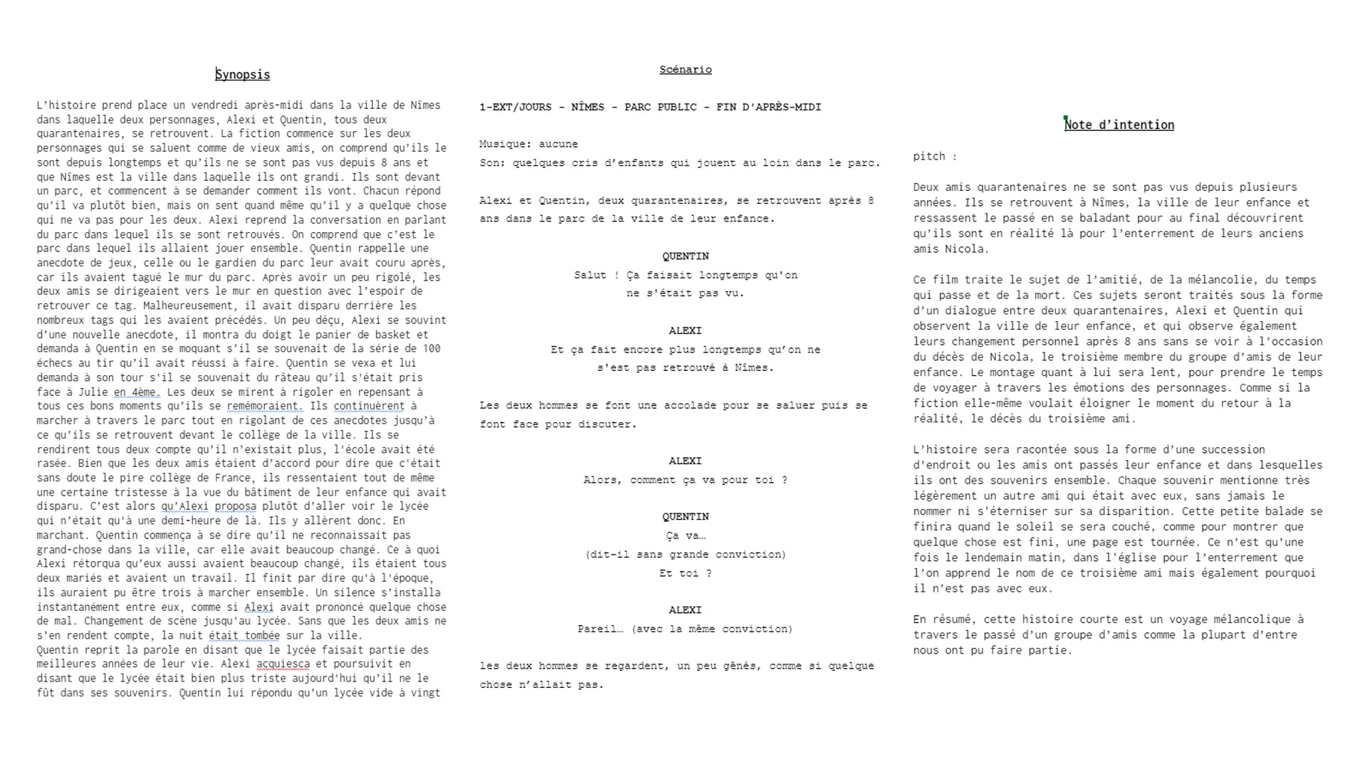 Pour apprendre à créer un court-métrage (sans le tourner), j'ai dû apprendre à créer un synopsis, un scénario et une note d'intention. Faire ces documents m'a fait comprendre le long travail de recherche et là qu'il faut avoir lors de l'élaboration d'un projet vidéo.
