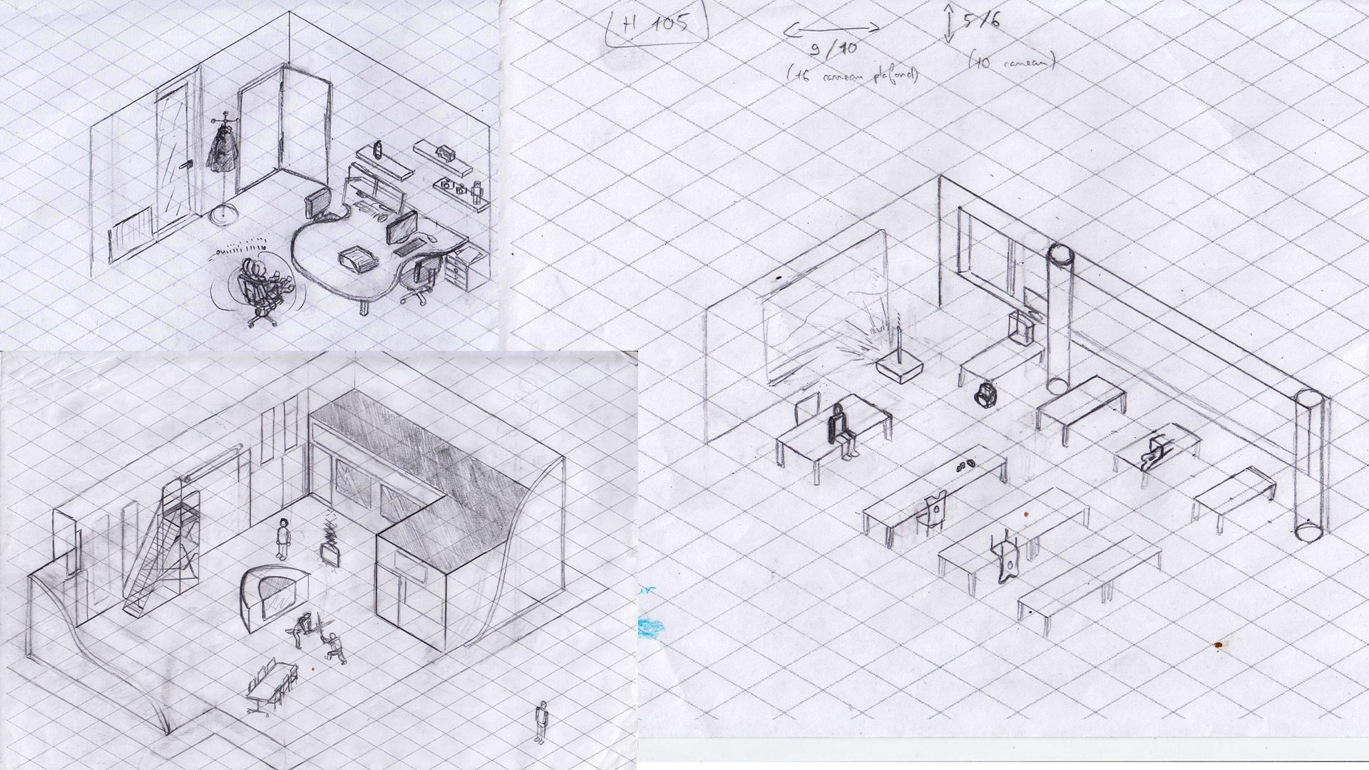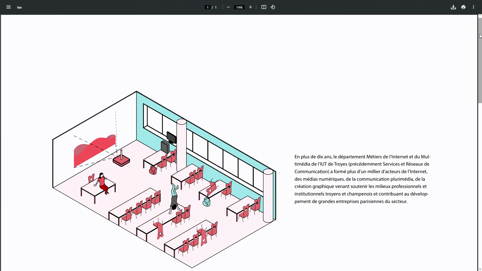 Faire ces plans isométriques m'a appris à trouver un style et à le maintenir sur plusieurs productions. Il fallait rester cohérent entre les différentes salles. La mise en page de ses plans pourrait également se rapporter à de l'interface web, car ils ont été faits pour être potentiellement placés sur le site du mmi de Troyes.