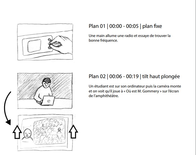 J'ai également pu, au cours de la sae 202 créer un story-board complet décrivant précisément chacun des plans de la vidéo de présentation. Chacun des plans étant accompagné de dessin représentatifs et de flèche indiquant les mouvements de caméra. Cela nous a permis à moi et à mon équipe, de travailler et filmer de manière méthodique et organisé.