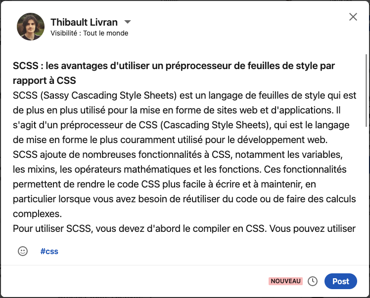 Durant cette année, j'ai pu continuer à développer ma présence et mon réseau professionnel, notamment en créant des publications telles que celle-ci et en engageant des discussions pour élargir mes relations avec mes collègues au sein de mon entreprise.